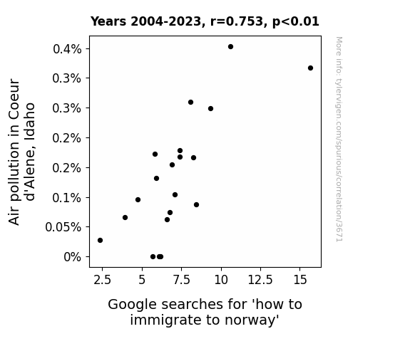 - The spurious research paper: A Breath of Fresh Air: Unpacking the Link Between Air Pollution in Coeur d'Alene and Norwegian Immigration Aspirations