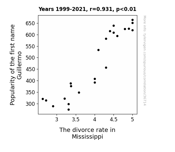 This means 86.7% of the change in the one variable (i.e., The divorce rate in Mississippi) is predictable based on the change in the other (i.e., Popularity of the first name Guillermo) over the 23 years from 1999 through 2021.