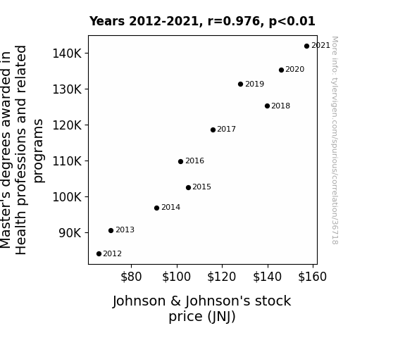 This means 95.2% of the change in the one variable (i.e., Johnson & Johnson's stock price (JNJ)) is predictable based on the change in the other (i.e., Master's degrees awarded in Health professions and related programs) over the 10 years from 2012 through 2021.