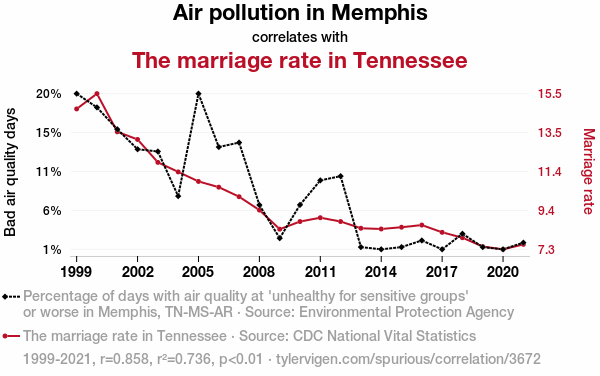 This means 73.6% of the change in the one variable (i.e., The marriage rate in Tennessee) is predictable based on the change in the other (i.e., Air pollution in Memphis) over the 23 years from 1999 through 2021.