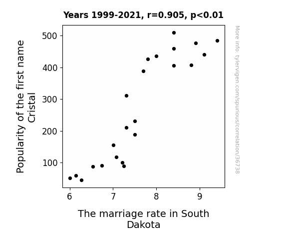 This means 81.9% of the change in the one variable (i.e., The marriage rate in South Dakota) is predictable based on the change in the other (i.e., Popularity of the first name Cristal) over the 23 years from 1999 through 2021.