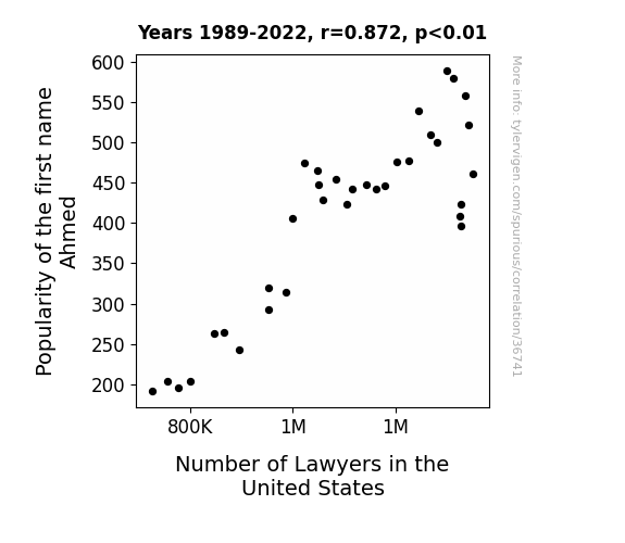 This means 76% of the change in the one variable (i.e., Number of Lawyers in the United States) is predictable based on the change in the other (i.e., Popularity of the first name Ahmed) over the 34 years from 1989 through 2022.