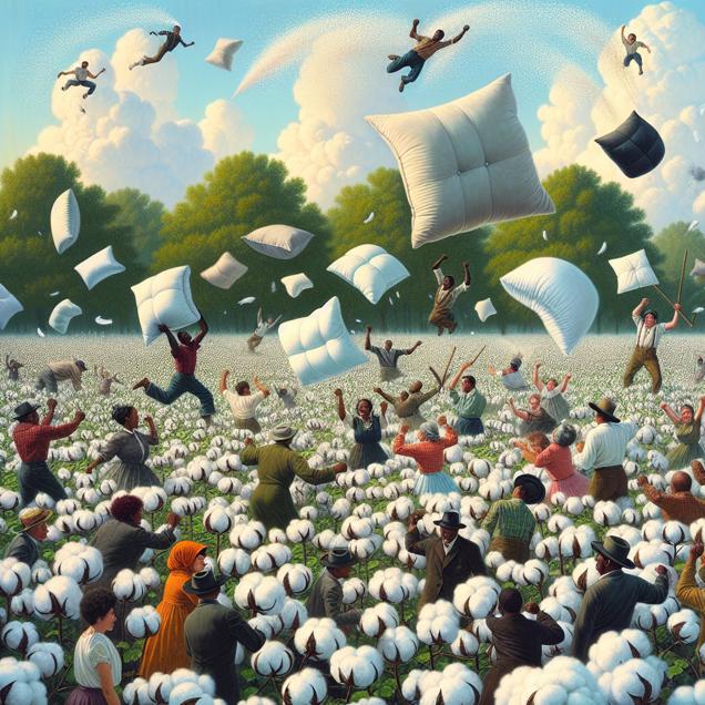 Prompt: [ Concept art ] Create an image inspired by Lumberton, North Carolina, with an imaginative twist. In the scene, lush cotton fields stretch as far as the eye can see, with larger-than-life, fluffy cotton clouds filling the sky. Below, the townspeople are shown engaged in playful pillow fights, with feathers from the pillows drifting through the air like snowflakes, creating a whimsically chaotic atmosphere. The depiction should include only scenes, people, and objects, it should not include text or speech bubbles.