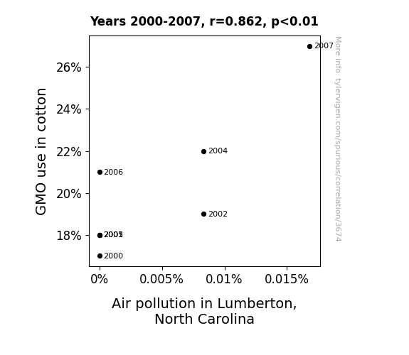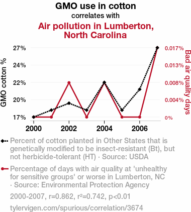 This means 74.2% of the change in the one variable (i.e., Air pollution in Lumberton, North Carolina) is predictable based on the change in the other (i.e., GMO use in cotton) over the 8 years from 2000 through 2007.