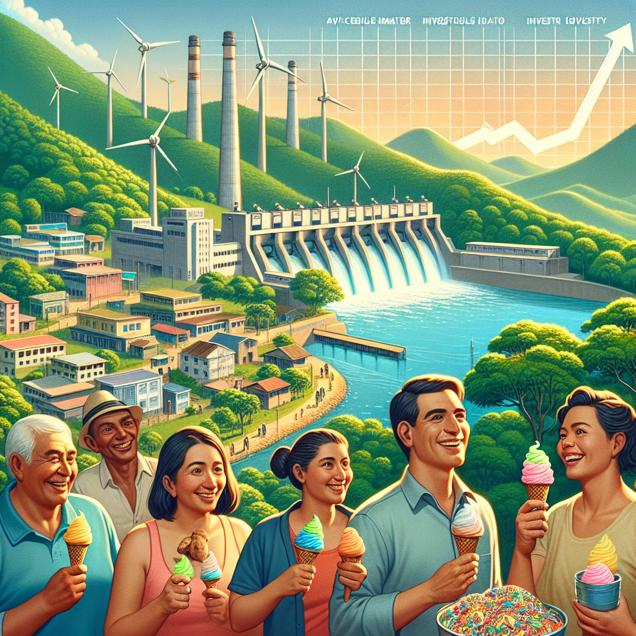User prompt: Please describe a visual scene that prominently depicts both Hydopower energy generated in El Salvador and Rio Tinto Group's stock price (RIO), in the following situation: Because the increase in Hydropower energy generated in El Salvador led to an influx of clean water, which boosted the production of ice cream, causing people to be in a better mood and more likely to invest in Rio Tinto Group, thus increasing their stock price.. Keep the description simple.