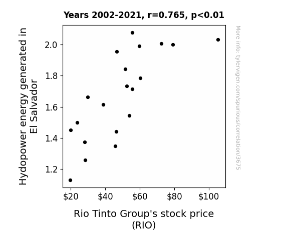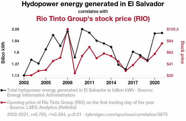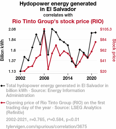 This means 58.4% of the change in the one variable (i.e., Rio Tinto Group's stock price (RIO)) is predictable based on the change in the other (i.e., Hydopower energy generated in El Salvador) over the 20 years from 2002 through 2021.