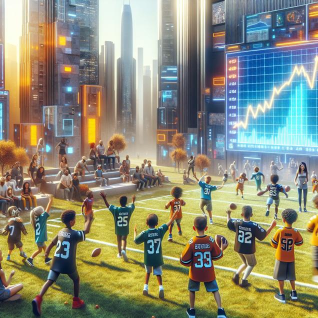 ChatGPT: Generate an image of a bustling futuristic city park with a group of children wearing Tom Brady jerseys playing football. The children are enthusiastically engaged in the game as proud parents cheer them on. In the background, a large digital screen displays the stock price of BBVA, showing a significant increase, symbolizing the surge in demand for football merchandise financed by the bank. The scene should capture a vibrant and technologically advanced urban setting, with sleek architecture and contemporary design elements.