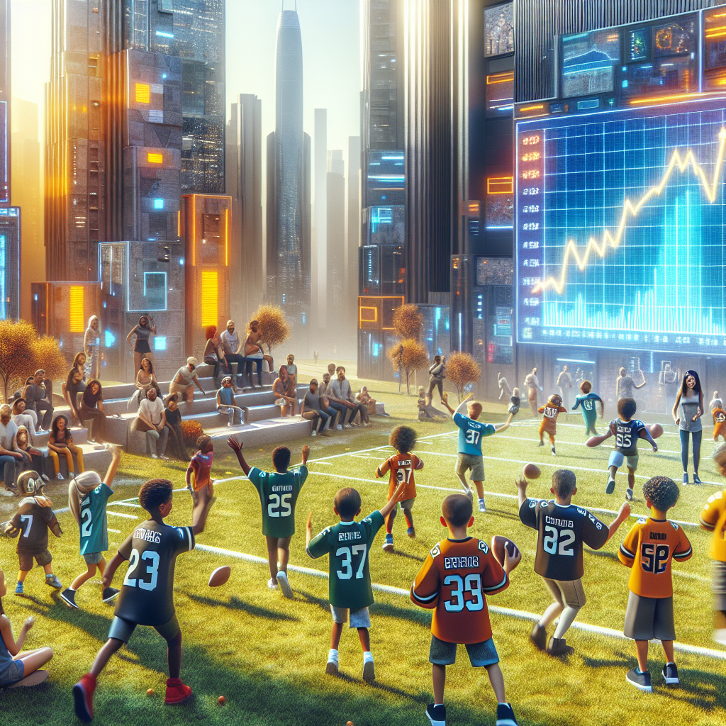 User prompt: Please respond with an image generation prompt that would be likely to create an interesting visual using DALLE-3, using the following style: [ Futuristic ] and depicting this scene: In a bustling city, a group of children wearing Tom Brady jerseys play football in a park, as proud parents cheer them on. Nearby, a large screen displays the stock price of BBVA, showing a significant increase, reflecting the surge in demand for football merchandise financed by the bank. Keep the visual depiction simple. Do not include any words or speech bubbles.