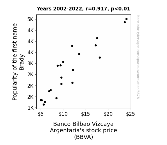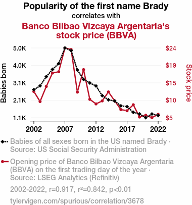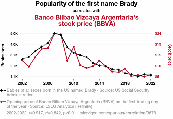 User prompt: Please provide potential search keywords for a paper titled Brady's Bizarre Boom: Bellying Up Banco Bilbao Vizcaya Argentaria's Stock Price with an abstract of This study delves into the surprising link between the popularity of the first name "Brady" in the United States and the stock performance of Banco Bilbao Vizcaya Argentaria (BBVA). Using data spanning the years 2002 to 2022 from the US Social Security Administration and LSEG Analytics (Refinitiv), our research team calculated a robust correlation coefficient of 0.9173487 with a statistically significant p-value of less than 0.01. This finding sheds light on the whimsical interplay between seemingly unrelated phenomena, prompting us to ponder: "Is it mere coincidence, or is there some mysterious Brady effect at play?"
