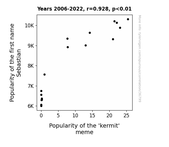This means 86.1% of the change in the one variable (i.e., Popularity of the 'kermit' meme) is predictable based on the change in the other (i.e., Popularity of the first name Sebastian) over the 17 years from 2006 through 2022.