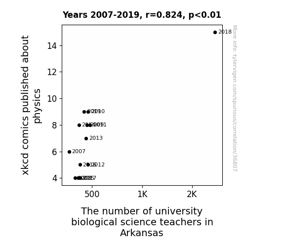 This means 67.9% of the change in the one variable (i.e., The number of university biological science teachers in Arkansas) is predictable based on the change in the other (i.e., xkcd comics published about physics) over the 13 years from 2007 through 2019.