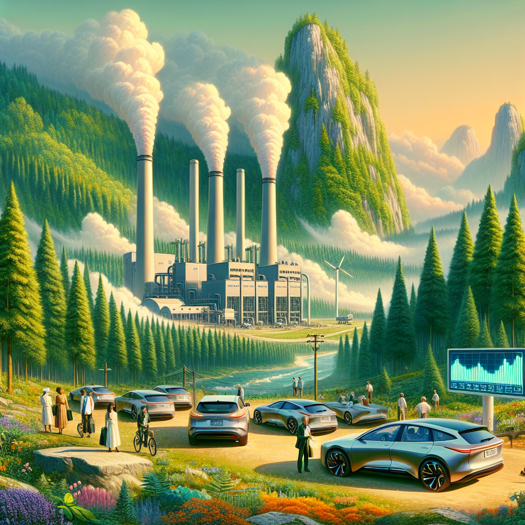 Prompt: Sure! Here's a refined image generation prompt for DALL·E-3: "Generate an image that resembles a scene from 'Skyrim'. Picture a lush, vivid forest in New Zealand with a towering Biomass power plant nestled within a clearing. From the chimneys of the power plant, gentle plumes of white smoke billow. Adjacent to the plant, a neat lineup of sleek Tesla electric cars is visible, with individuals enthusiastically test driving them. A nearby digital screen displays the Tesla stock ticker, showing a steady rise in stock price. This reflects the escalating demand for electric vehicles elicited by New Zealand's amplified Biomass power generation efforts to combat climate change. Each component should be carefully detailed, capturing the dynamic interaction between nature, technology, and environmental consciousness." The depiction should include only scenes, people, and objects, it should not include text or speech bubbles.