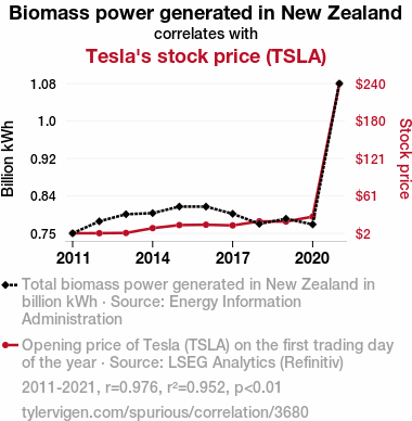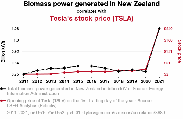 A linear line chart with years as the X-axis and two variables on the Y-axis. The first variable is Biomass power generated in New Zealand and the second variable is Tesla's stock price (TSLA).  The chart goes from 2011 to 2021, and the two variables track closely in value over that time. Small Image