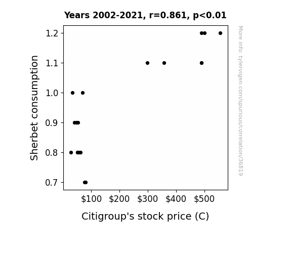 This means 74.2% of the change in the one variable (i.e., Citigroup's stock price (C)) is predictable based on the change in the other (i.e., Sherbet consumption) over the 20 years from 2002 through 2021.