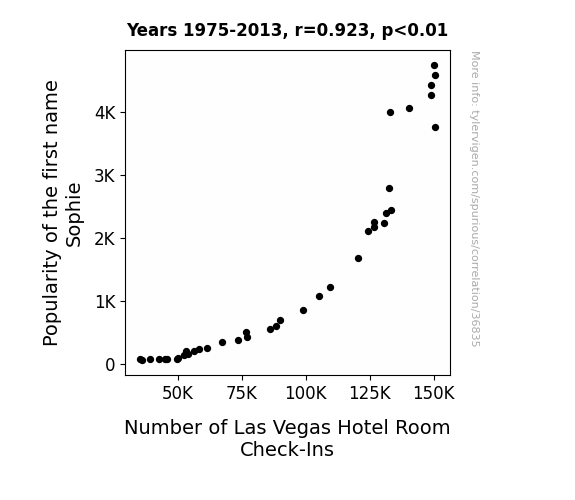 This means 85.2% of the change in the one variable (i.e., Number of Las Vegas Hotel Room Check-Ins) is predictable based on the change in the other (i.e., Popularity of the first name Sophie) over the 39 years from 1975 through 2013.