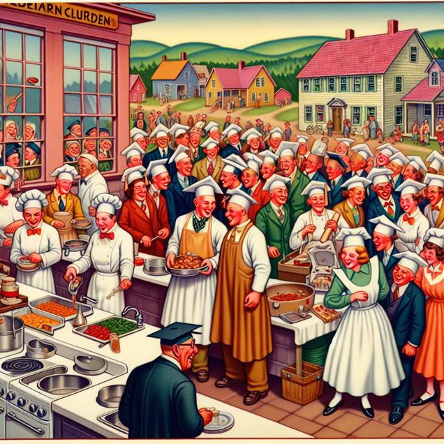 ChatGPT: Generate an image that resembles a still from a Disney movie, wherein a vibrant and bustling kitchen setting is depicted. In the foreground, several students are joyfully receiving their Associates degrees in Culinary, entertainment, and personal services. The kitchen exudes an atmosphere of achievement and celebration. Meanwhile, in the background, a group of burglars roam aimlessly in a quaint West Virginia setting, scratching their heads in confusion as they realize the lack of potential targets. The contrast between the jubilant scene in the kitchen and the perplexed burglars in the distant background should be highlighted, evoking a sense of whimsy and intrigue.