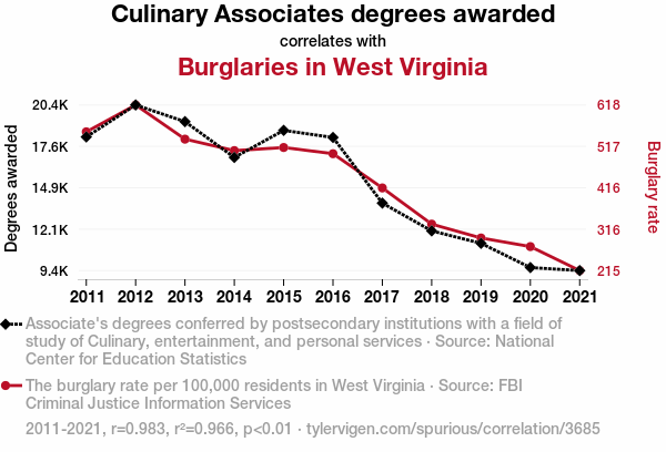 The data for this study was collected from the National Center for Education Statistics and the FBI Criminal Justice Information Services. The number of Culinary Associates degrees awarded was obtained from the Integrated Postsecondary Education Data System (IPEDS), while the incidence of burglaries in West Virginia was extracted from the FBI's Uniform Crime Reporting (UCR) program. The years 2011 to 2021 were selected for analysis, providing a substantial time frame to capture any potential trends or fluctuations in the variables of interest.
