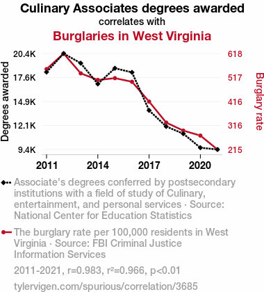 culinary degrees, burglaries, correlation analysis, West Virginia, National Center for Education Statistics, FBI Criminal Justice Information Services, correlation coefficient, p-value, 2011-2021, causation, crime research