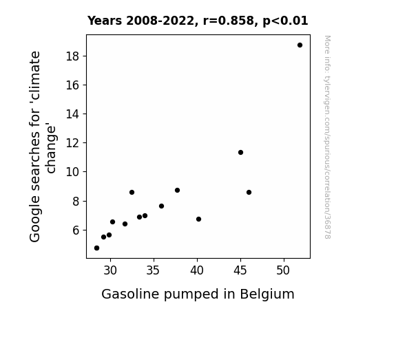 This means 73.7% of the change in the one variable (i.e., Gasoline pumped in Belgium) is predictable based on the change in the other (i.e., Google searches for 'climate change') over the 15 years from 2008 through 2022.