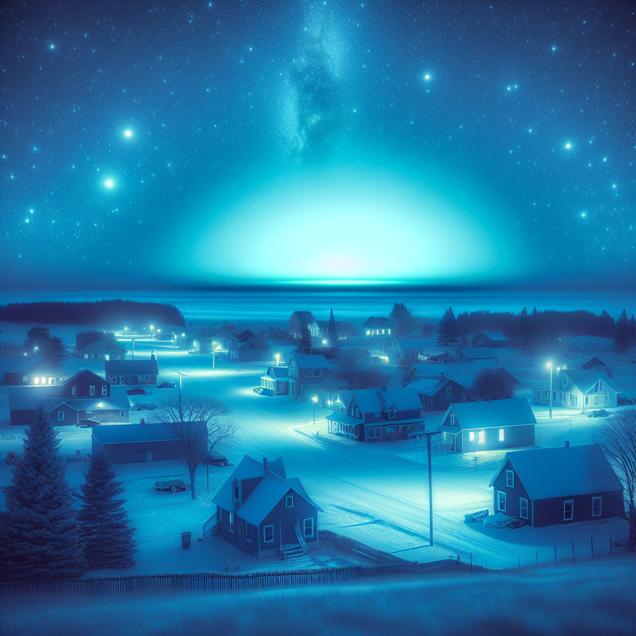 Prompt: Generate an image of a quaint South Dakota town under a starry night sky, with the distant glow of Neptune filling the horizon. The town's houses and businesses stand peacefully and secure, undisturbed by any criminal activity. The icy blue glow of Neptune creates a serene and otherworldly ambiance, casting a cold, protective light across the tranquil landscape. The depiction should include only scenes, people, and objects, it should not include text or speech bubbles.