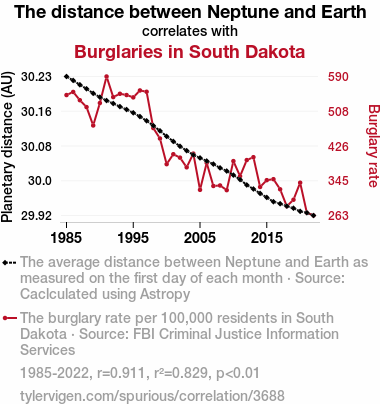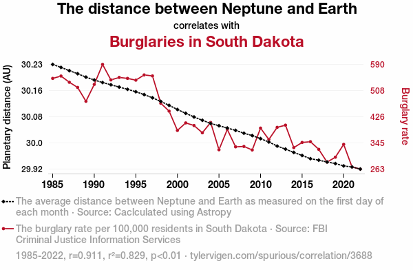 This means 82.9% of the change in the one variable (i.e., Burglaries in South Dakota) is predictable based on the change in the other (i.e., The distance between Neptune and Earth) over the 38 years from 1985 through 2022.
