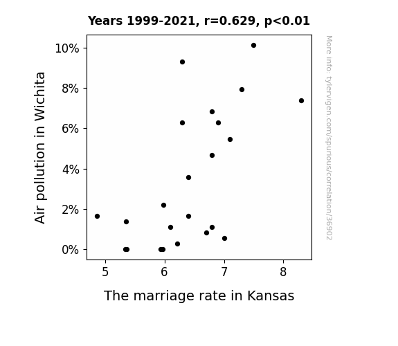 This means 39.5% of the change in the one variable (i.e., The marriage rate in Kansas) is predictable based on the change in the other (i.e., Air pollution in Wichita) over the 23 years from 1999 through 2021.
