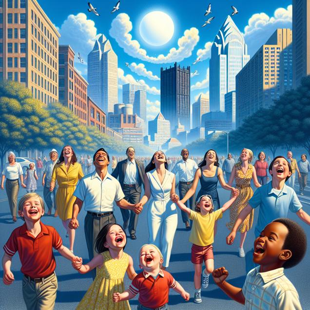 Prompt: Create an image showing a vibrant and dynamic TIME magazine cover image with a depiction of a clear, blue sky over Pittsburgh. In the foreground, children are seen laughing and playing outdoors without any respiratory concerns. In the background, multiple families with triplets or more are joyfully walking together, immersed in the improved air quality. The scene should convey a sense of relief and joy as the community enjoys the pollution-free environment. The depiction should include only scenes, people, and objects, it should not include text or speech bubbles.