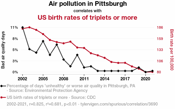 This means 68.1% of the change in the one variable (i.e., US birth rates of triplets or more) is predictable based on the change in the other (i.e., Air pollution in Pittsburgh) over the 20 years from 2002 through 2021.