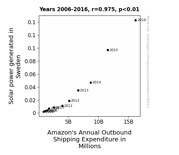 This means 95.1% of the change in the one variable (i.e., Amazon's Annual Outbound Shipping Expenditure in Millions) is predictable based on the change in the other (i.e., Solar power generated in Sweden) over the 11 years from 2006 through 2016.