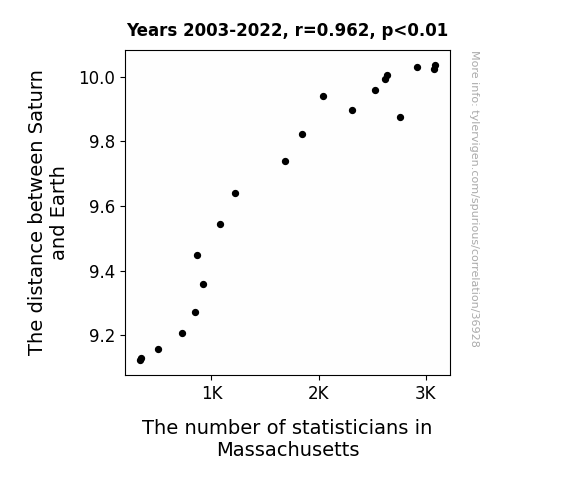 This means 92.5% of the change in the one variable (i.e., The number of statisticians in Massachusetts) is predictable based on the change in the other (i.e., The distance between Saturn and Earth) over the 20 years from 2003 through 2022.