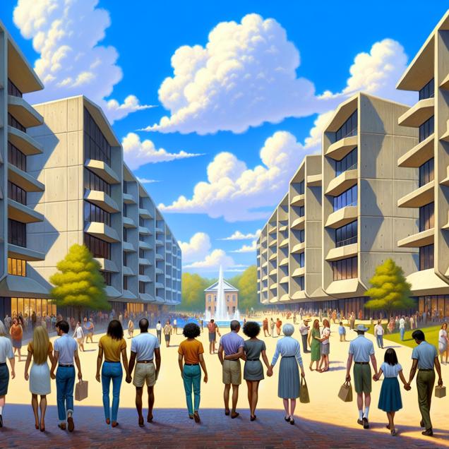 ChatGPT: Generate an image of a serene scene set in Greenville, North Carolina, with a Brutalist style. The buildings are angular and imposing, contrasting against the bright blue sky and fluffy white clouds. People are leisurely strolling through the town, socializing and enjoying the fresh air. In the background, couples are holding hands and smiling, exuding a sense of peace and contentment. A prominent sign indicates a decreasing divorce rate, symbolizing the improved harmony and reduced conflict within the community. The overall scene should encapsulate the harmony and optimism of the town in a visually striking Brutalist interpretation.