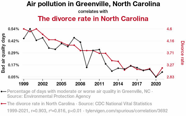 - The spurious research paper: Breathless in Greenville: The Correlation between Air Pollution and Divorce Rates in North Carolina