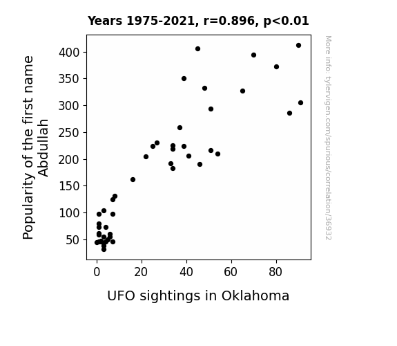 This means 80.2% of the change in the one variable (i.e., UFO sightings in Oklahoma) is predictable based on the change in the other (i.e., Popularity of the first name Abdullah) over the 47 years from 1975 through 2021.