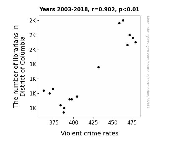 This means 81.4% of the change in the one variable (i.e., Violent crime rates) is predictable based on the change in the other (i.e., The number of librarians in District of Columbia) over the 16 years from 2003 through 2018.