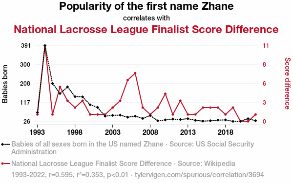 This means 35.3% of the change in the one variable (i.e., National Lacrosse League Finalist Score Difference) is predictable based on the change in the other (i.e., Popularity of the first name Zhane) over the 30 years from 1993 through 2022.