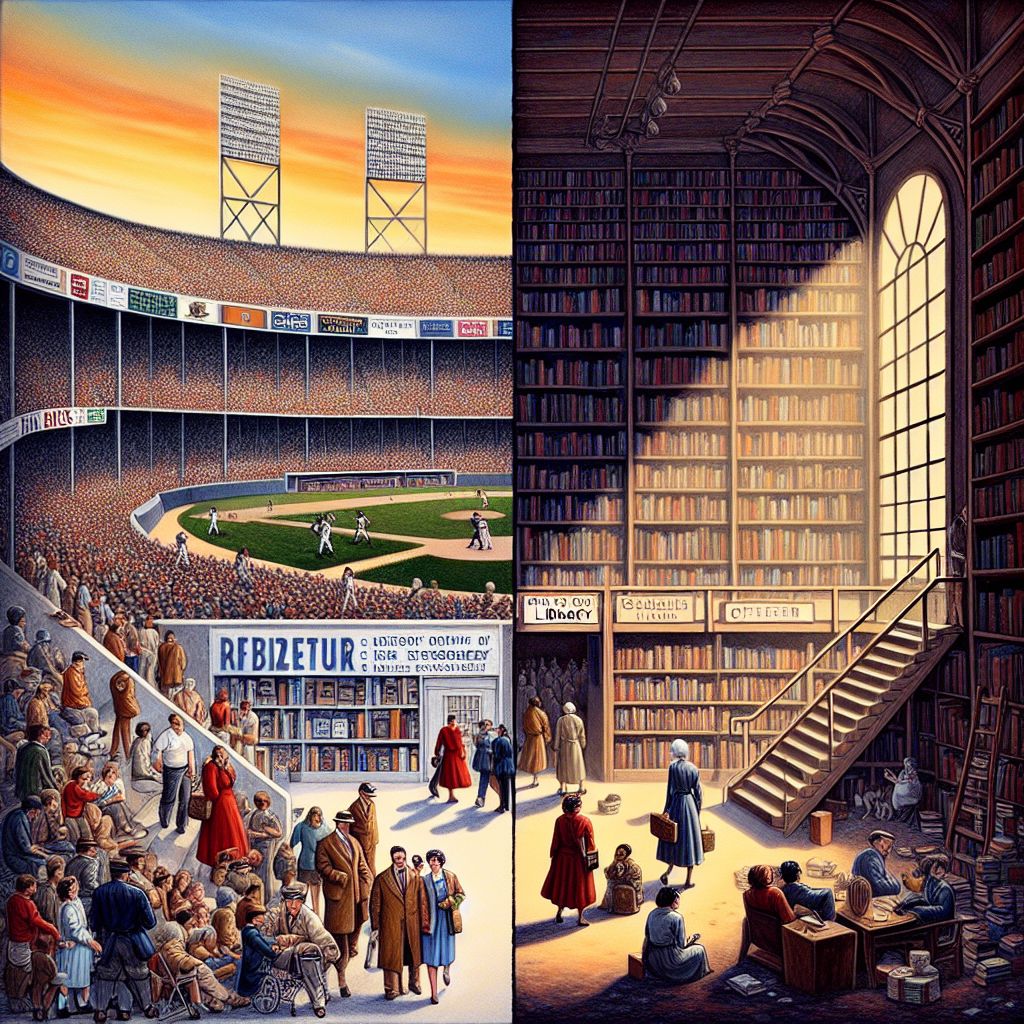 User prompt: Please respond with an image generation prompt that would be likely to create an interesting visual using DALLE-3, using the following style: [ An image that looks like it is a scene from A Disney Movie ] and depicting this scene: On a sunny day at the Detroit Tigers' stadium, the team's scoreboard shows the number of games they've lost in the season. Nearby, in a tranquil library in Rhode Island, a group of new librarians eagerly welcome visitors, surrounded by shelves of books. The calming atmosphere created by the librarians has drawn an increasing number of visitors, who are finding solace in the world of books amidst the Tigers' struggles on the baseball field. Keep the visual depiction simple. Do not include any words or speech bubbles.
