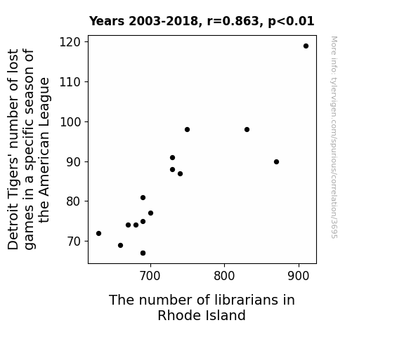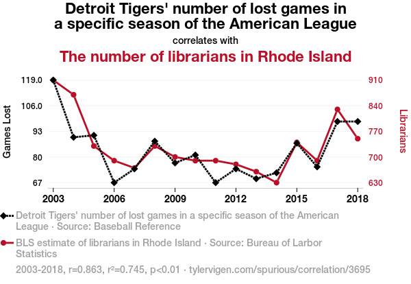 This means 74.5% of the change in the one variable (i.e., The number of librarians in Rhode Island) is predictable based on the change in the other (i.e., Detroit Tigers' number of lost games in a specific season of the American League) over the 16 years from 2003 through 2018.