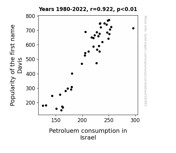 This means 84.9% of the change in the one variable (i.e., Petroluem consumption in Israel) is predictable based on the change in the other (i.e., Popularity of the first name Davis) over the 43 years from 1980 through 2022.