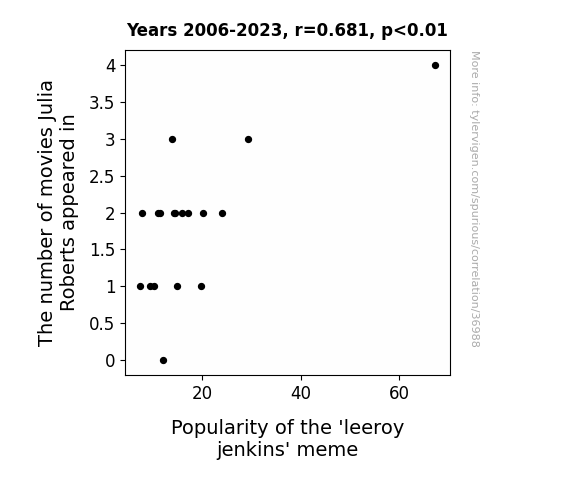 This means 46.4% of the change in the one variable (i.e., Popularity of the 'leeroy jenkins' meme) is predictable based on the change in the other (i.e., The number of movies Julia Roberts appeared in) over the 18 years from 2006 through 2023.