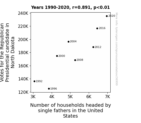 This means 79.4% of the change in the one variable (i.e., Number of households headed by single fathers in the United States) is predictable based on the change in the other (i.e., Votes for the Republican Presidential candidate in North Dakota) over the 8 years from 1990 through 2020.