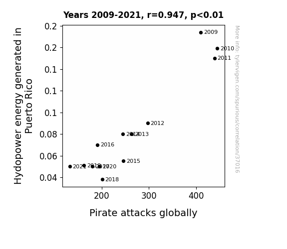 This means 89.7% of the change in the one variable (i.e., Pirate attacks globally) is predictable based on the change in the other (i.e., Hydopower energy generated in Puerto Rico) over the 13 years from 2009 through 2021.
