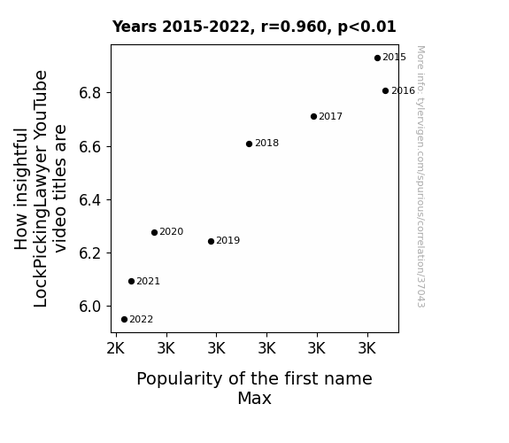 This means 92.3% of the change in the one variable (i.e., Popularity of the first name Max) is predictable based on the change in the other (i.e., How insightful LockPickingLawyer YouTube video titles are) over the 8 years from 2015 through 2022.