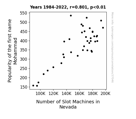 This means 64.1% of the change in the one variable (i.e., Number of Slot Machines in Nevada) is predictable based on the change in the other (i.e., Popularity of the first name Mohammad) over the 39 years from 1984 through 2022.