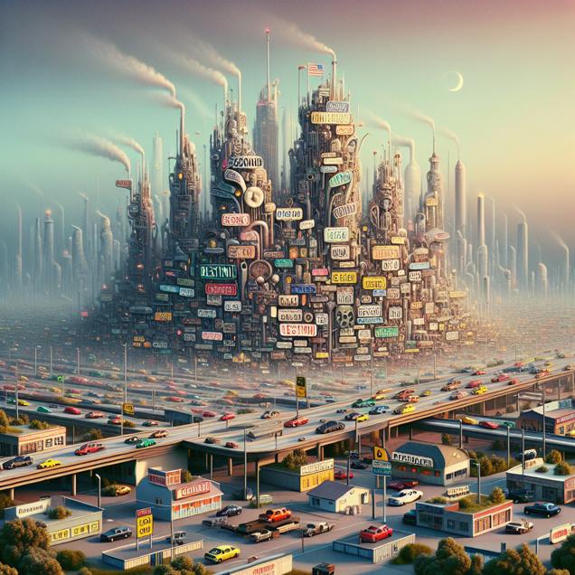 ChatGPT: Generate an image of a surrealistic cityscape in DeRidder, Louisiana, where personalized license plates adorn the multiplying cars filling the streets. Show a peculiar air pollution haze enveloping the city, where whimsical and fantastical elements weave seamlessly into the urban landscape. Capture the eerie atmosphere created by the rising popularity of the name Destini, and convey the haphazard growth of the city against a backdrop of polluted skies.