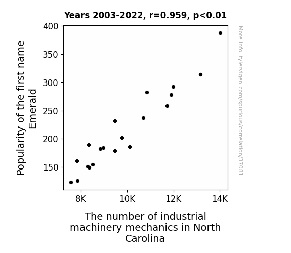 This means 91.9% of the change in the one variable (i.e., The number of industrial machinery mechanics in North Carolina) is predictable based on the change in the other (i.e., Popularity of the first name Emerald) over the 20 years from 2003 through 2022.