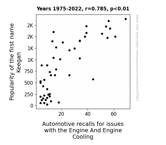 This means 61.7% of the change in the one variable (i.e., Automotive recalls for issues with the Engine And Engine Cooling) is predictable based on the change in the other (i.e., Popularity of the first name Keegan) over the 48 years from 1975 through 2022.
