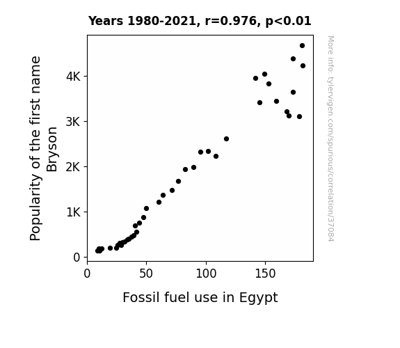 This means 95.3% of the change in the one variable (i.e., Fossil fuel use in Egypt) is predictable based on the change in the other (i.e., Popularity of the first name Bryson) over the 42 years from 1980 through 2021.