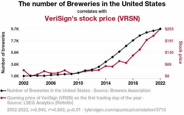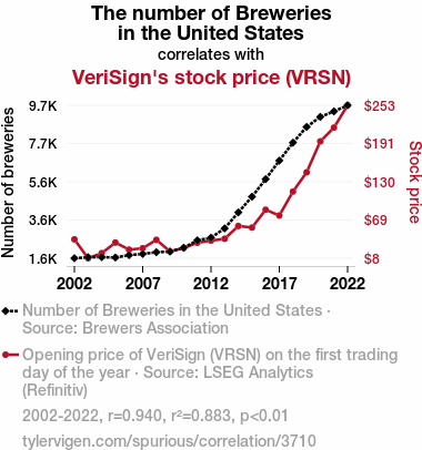 - The spurious research paper: Brewing Up Stocks: An Examination of the Relationship between the Number of Breweries in the United States and VeriSign's Stock Price