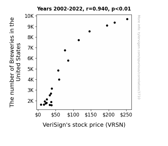 The investigation into the relationship between the number of breweries in the United States and VeriSign's stock price (VRSN) has yielded results akin to a well-crafted, perfectly poured beverage. For the period spanning 2002 to 2022, a robust correlation coefficient of 0.9396137 has been unveiled, suggesting a remarkably strong association between these seemingly disparate variables. The r-squared value of 0.8828739 further fortifies this finding, indicating that approximately 88.29% of the variation in VRSN stock price can be attributed to the number of breweries in the U.S.
