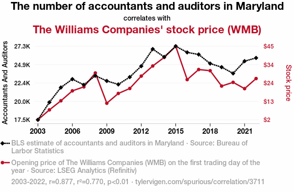 A linear line chart with years as the X-axis and two variables on the Y-axis. The first variable is The number of accountants and auditors in Maryland and the second variable is The Williams Companies' stock price (WMB).  The chart goes from 2003 to 2022, and the two variables track closely in value over that time. Small Image